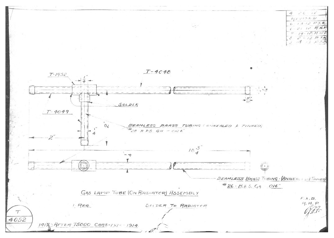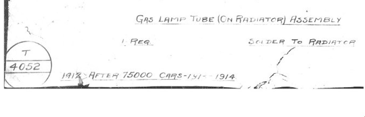 When i first plumbed my 1914 touring, i lit the headlights and had a flame at the burner, below the burner and outside of the lamp! Later i found the prints for the hoses and they clearly state that the last inch of each hose was to be dipped in shellac. This sealed the hoses nicely and no more multiple flames. In 1913-14 the line was a multiple piece assembly using seamed metal tubing in the center and seamless tubing with an adapter fitting on each end. The entire assembly was tinned with solder to seal all the joints. This tube ran inside the frame rail in these years with a short piece of hose to connect it to the crossover pipe on the radiator. There was one or two clamps that held the tube made from fender scrap. They bolted to the engine splash shield holes at the front and behind the pan arms. The bolts had square heads and nuts.