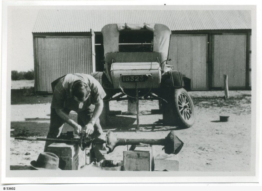 Dr. Walker putting a new crown wheel on his car; a cog was chipped whilst crossing the 30 miles of ironstone boulders on the Arcoona tableland.