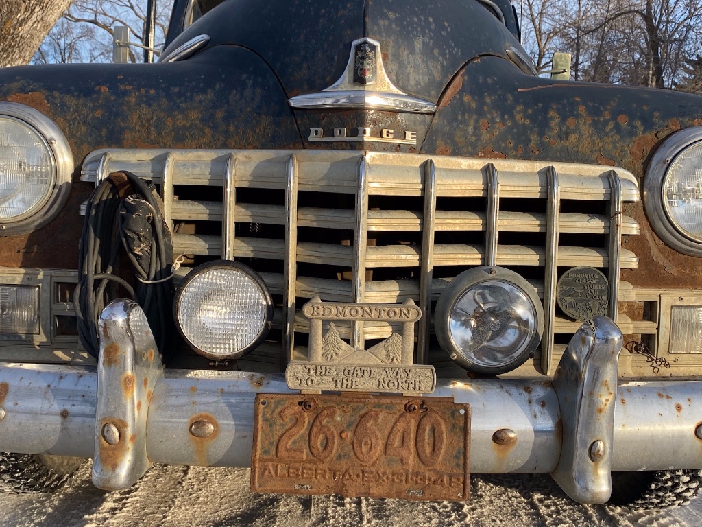 The license plate may be of of some interest... the stamped EX-31-3-48 identifies this as a 1947 plate as is the car, a 1947 Dodge Canadian-built using the Plymouth body shell and mechanicals. Alberta vehicle registrations expired on the last day of March until 1984, when we switched to rolling monthly expiries (alphabetically).