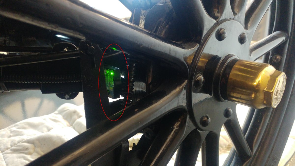 Here the sensor is temporarily mounted. My Lizzy has AC brakes installed. This braked have a spring for opening and a lever for closing. The sensor will sit between spring and lever (there it is in a safe place and not so exposed) in a distance of 12mm (~1/2") from the wooden spokes.