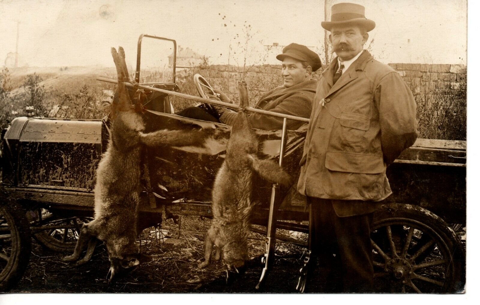They look like coyotes to me.......and the gun leaning against the car appears to be a Browning automatic (or clone, like a Remington).
