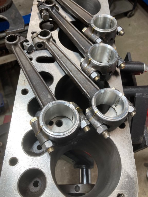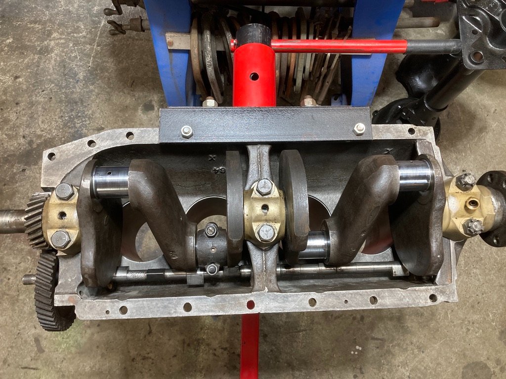 Just some updates on the progress (or lack of) on the Orville Enyeart engine built for Andy Mounce. I've posted before, but as originally built the bore was 3.8750" and the stroke was increased to 4 5/8" by using a Model B crank and grinding the main and rod journals offset to Model A specs and using a 7" connecting rod. The engine when I got it appeared to have broken a ring and destroyed what I expect were custom Egge pistons as well as scoring the already oversize bore. I had Joe Bell pour new babbitt and the engine was sleeved to standard, now the engine is only 204 cubic inch. A lot of close fits with the cam shaft and the connecting rods when you move everything down and close to one another. I'll post more as work progress (rods are out for babbitting), hoping that by this time next year the engine should be together. I would like to solicit some advice on: