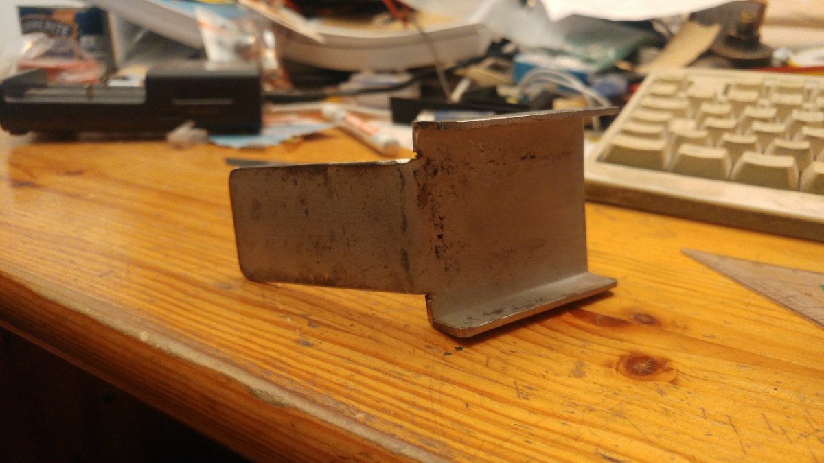 This is the rough cut&bend of the holder. It perfectly slides over the radius rod with only a very little play. The sensor mounting holes are already marked but not drilled. Long-nuts for clamping are not welded on yet.