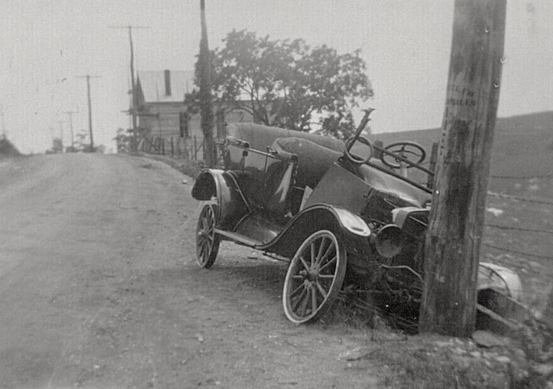 I'm not sure of the year of the car into the pole picture, but WWI was probably in progress and tires would have been very hard to come by but Fords could be replaced! (maybe)
