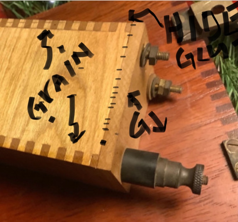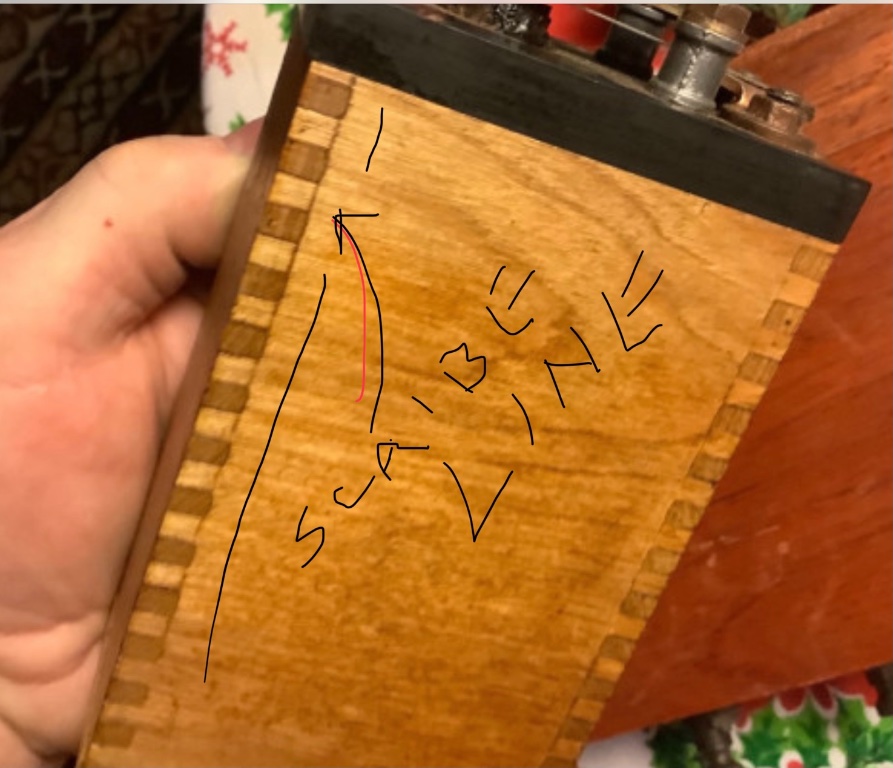Note the coil construction. The box jointed case has a bottom that has been glued on with hide glue, and they have shrunk because of the cross grain situation. The glue has let loose on this joint only. Hide glue is unmistakable, when bottoms were taken off. ALSO, note the light scribe line on the box joints. This likely wouldn’t have been done or used on a mass produced item.