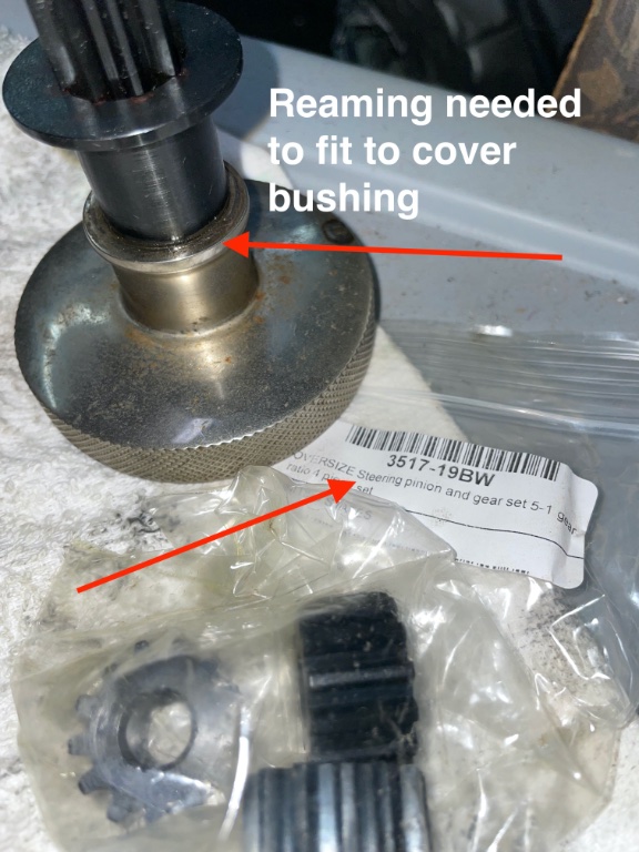Only an 'oversize' pinion shaft is avail, it comes with the new gears of stock size. You have to ream the case cover to fit that new pinion, and that will really make your steering case and gears work almost like NOS! Lots of time the looseness of that steering pinion that holds the steering wheel is what can cause the wobble feeling of control as you turn the steering wheel.