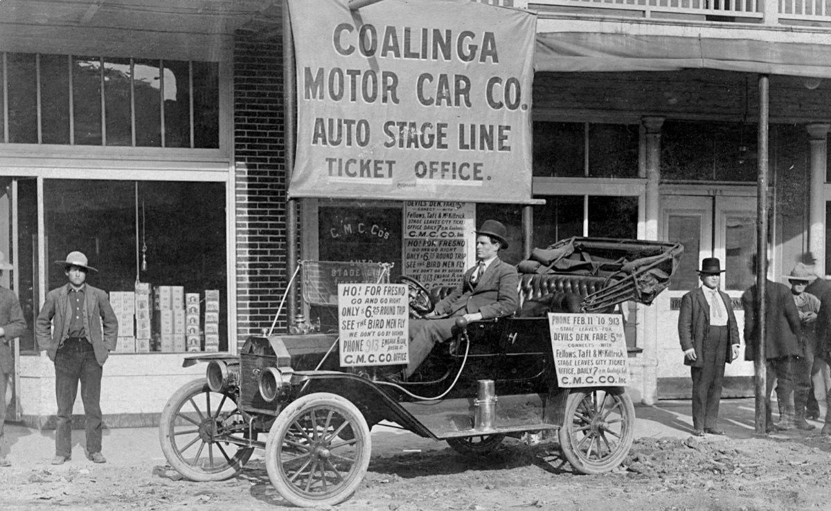 I liked seeing the picture of the Coalinga Motor Stage and the 1912 Model T. The trip from Coalinga Ca to Fresno Ca only takes under 90 minutes today but in the teens and early twenties it was a half day. I once knew a fellow that made the trip from Fresno to Coalinga as a 10 year old boy with his family, in the family’s well worn 1914 T, in the early 1920’s. He would remember the trip because they left for the coast, with a over night stay in Coalinga. The last part of the trip to Coalinga was after dark and the lights kept blowing out due to low gas pressure in the Prestolite tank, so it was only moon light and side lites to get to Coalinga.