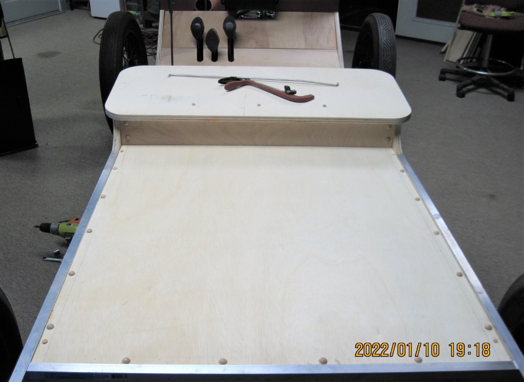 Build progress pictures, this afternoon rear deck, floor (not finished), all body brackets done, seat riser and hinged top, seats will be a week or two.