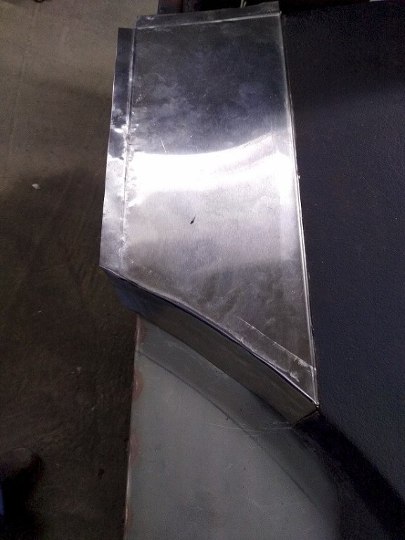 So, the rust ate up pretty high all around the bottom. This is left side bottom, between the driver's door ans the wheel well. The green etch primer is a stainless steel patch panel that I made some time ago, attached by stainless wire flux core welding. I am now just getting to the next piece, also stainless. The patch panels that I bought were too small for the damage from rot and I found some paper towel dispensers from a men's rest room that were being replaced during a remodel,