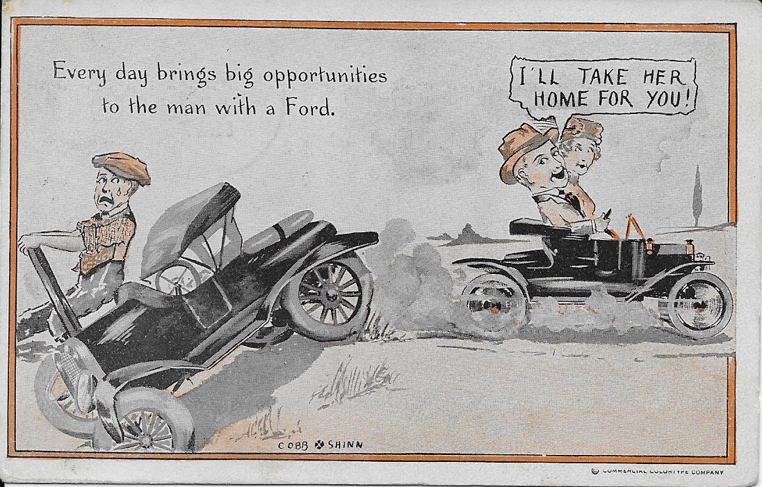It was about that time that Shinn came to the attention of the Ford Motor Company. It seems that Henry Ford recognized that the jibes at his Model T (first built in 1908) could be turned to his advantage. Shinn began providing humorous cards poking fun at the Model T. Henry Ford is reputed to have said that “every time someone laughs at a joke about the Model T, I sell another car.”"