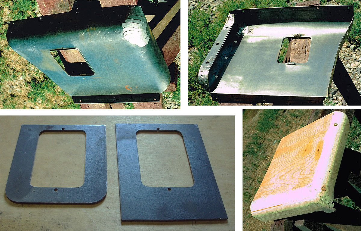 This turtle deck lid I made for a deck that was torn and flattened. It was for my first "Rusty" build and didn't have to be perfect. I bent the edge around a piece of particleboard. It took the outside some time to match the rest of the car but the inside has only rusted as shown in 20 some years and sitting outdoors. (Idaho) The handle was a flattened bolt shank and still has some zinc on it. What reminded me of this was remembering a ruined, rusty splash apron I sacrificed to make the missing piece in the deck. It is shown at top of the first photo with a new bead rolled into it. Then it was simply screwed into place.