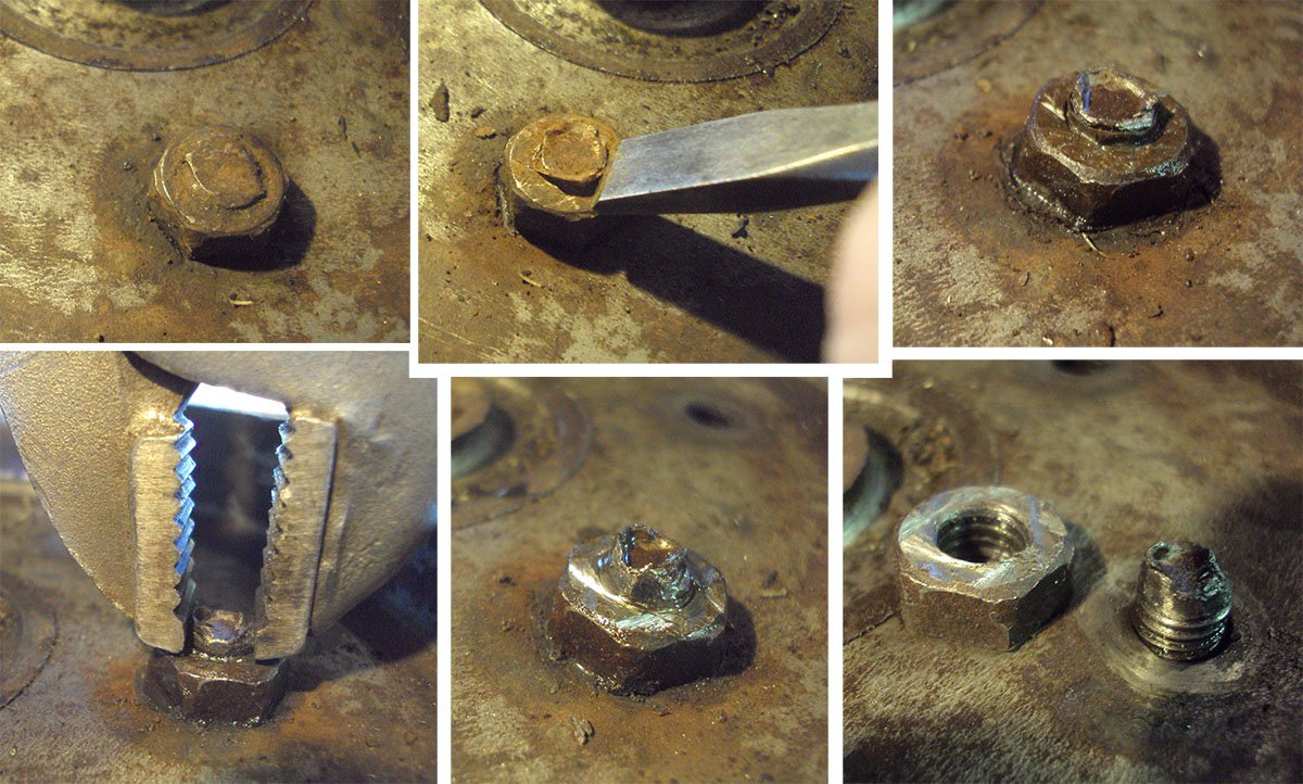 Since these are peened over I need to get the mushroomed metal back to a smaller diameter to keep from loosing the nut threads. Tightening the nut will expose more of the bolt thread. Starting with a chisel I lift the edge up. Then I can pinch it with vise grips. Heat could be used to anneal the end of the bolt. A little grinding can also help. Sadly you can't get down far enough to remove all of the compressed metal and the nut will suffer some thread damage. I turn the nut back and forth a lot as I remove the nut. Penetrating oil helps too.