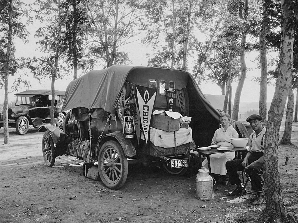 I believe that "auto camping" was very popular at one time. Also, people traveling any distance in many parts of the country had to carry their own supplies, or do without. Accomodations were scarce in many areas.