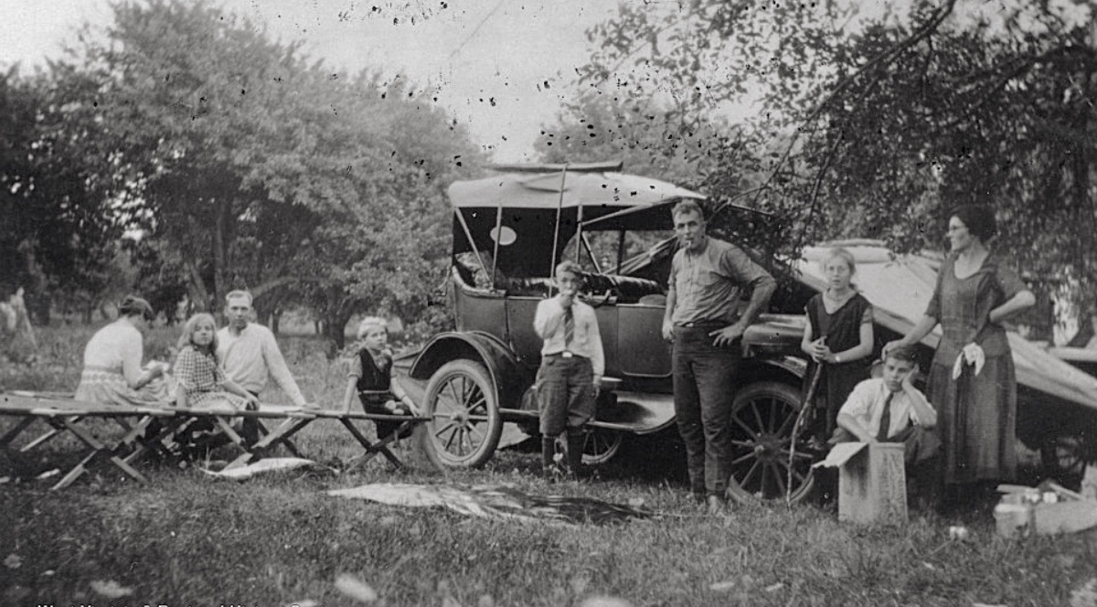 My family's trip was made in a 1921 Sheridan. The group consisted of the two adults (my grandparents) and their six children, 3 boys and 3 girls ranging in age from 4 years to 18 years. They had two fly tents, one for each side of the car. Grandma took the three girls on her side and grandpa took the three boys on his side.