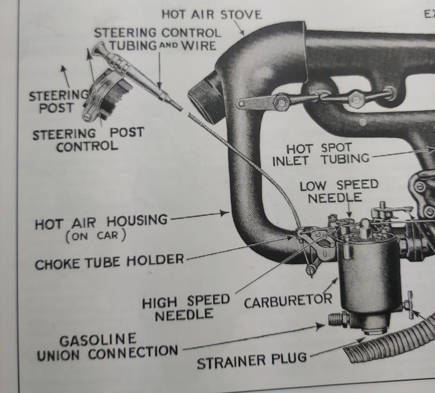 Michael, I’m not sure how accurate the sales display is now. It has a ( copper) plumbing fitting where the air valve would go, and also missing the choke cable clamp. I’d bet the original would have the steering column choke control displayed also. I’m not picking it apart, and only wish it was hanging on my wall!