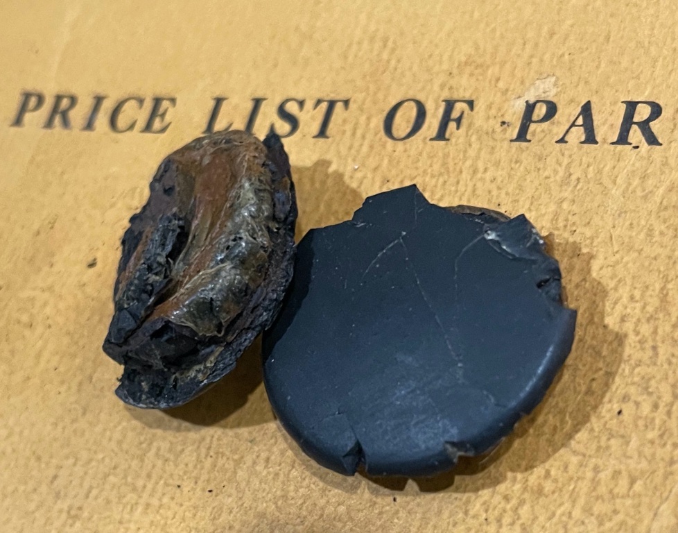 These plugs are original to my 1925, found as is in a barn in 1977. They were in an old tire patch canister, and they are aged for sure. Did place them sometime ago in the side panels when the arms were out. Used some glue on them to keep from falling out on the road, so that is the brown residue now on them.