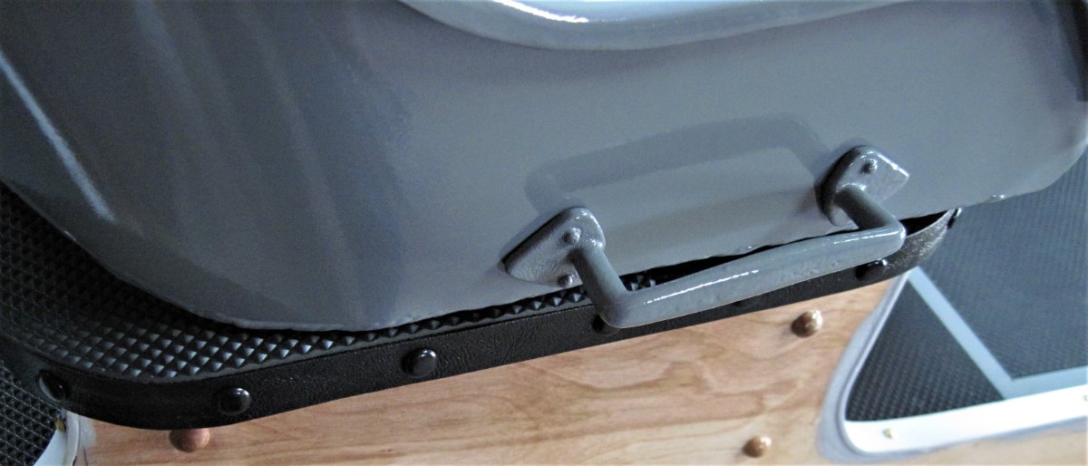 I put some grey paint on seat backs, blacked out wood base and used some T trim around edge, repurposed the hood handles with one I riveted on the passenger seat for lifting that side to gain access to under seat storage and as a grab handle, the other handle goes on top of tool box .