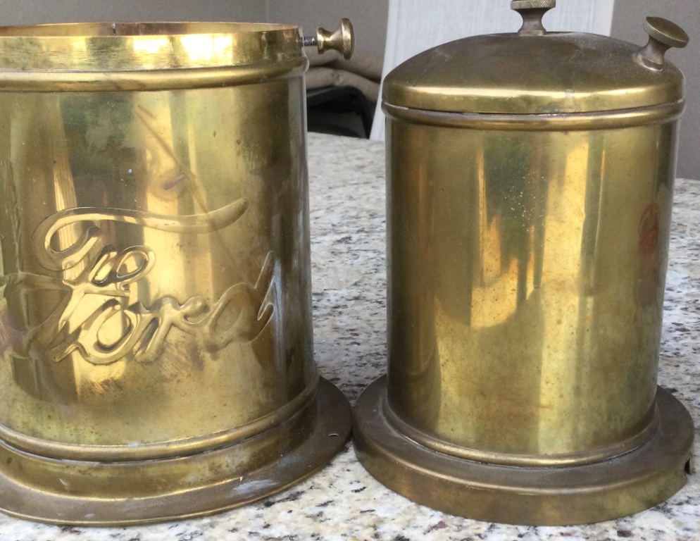 This carbide generator came with the 1912 model T I bought about 5 years ago. It is not correct, in fact far from it. Looks home made but cute with the Ford logo. There is no guts in it, but I have a spare screen if needed, but it is for show only, not functioning.
