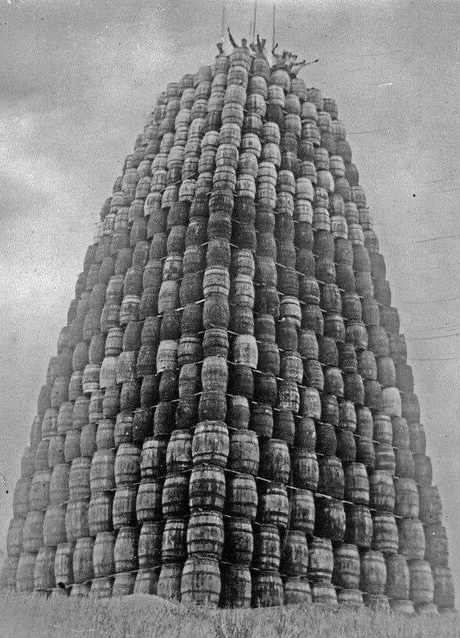 Their nefarious plan was to add enough black-strap molasses, chloroform, shag tobacco and cheap Tabasco sauce to the creek water, and pass it off as "aged in the barrel" Happy Sally. The plan may have worked if they hadn't made the mistake of attempting to sell a barrel of the counterfeit brew to Cuthbert Maddox. His educated palate immediately detected the ruse, and he exclaimed, "This stuff tastes too good to be genuine Happy Sally. I think you owl-hoots are tryin' to pull a fast one. " Drawing his trusty Schofield, Cuthbert detained the evil-doers until Sheriff Dumbrow could arrive from Saddle String. The Absquatulation League escaped however, and left the Basin for good. The tower of barrels stood for some years on the outskirts of Chugwater until it collapsed in an avalanche of barrel staves and polluted water in an unseasonable high wind. Fortunately, thre were no drowning victims, once again owing to the heroics of the Escalation League.