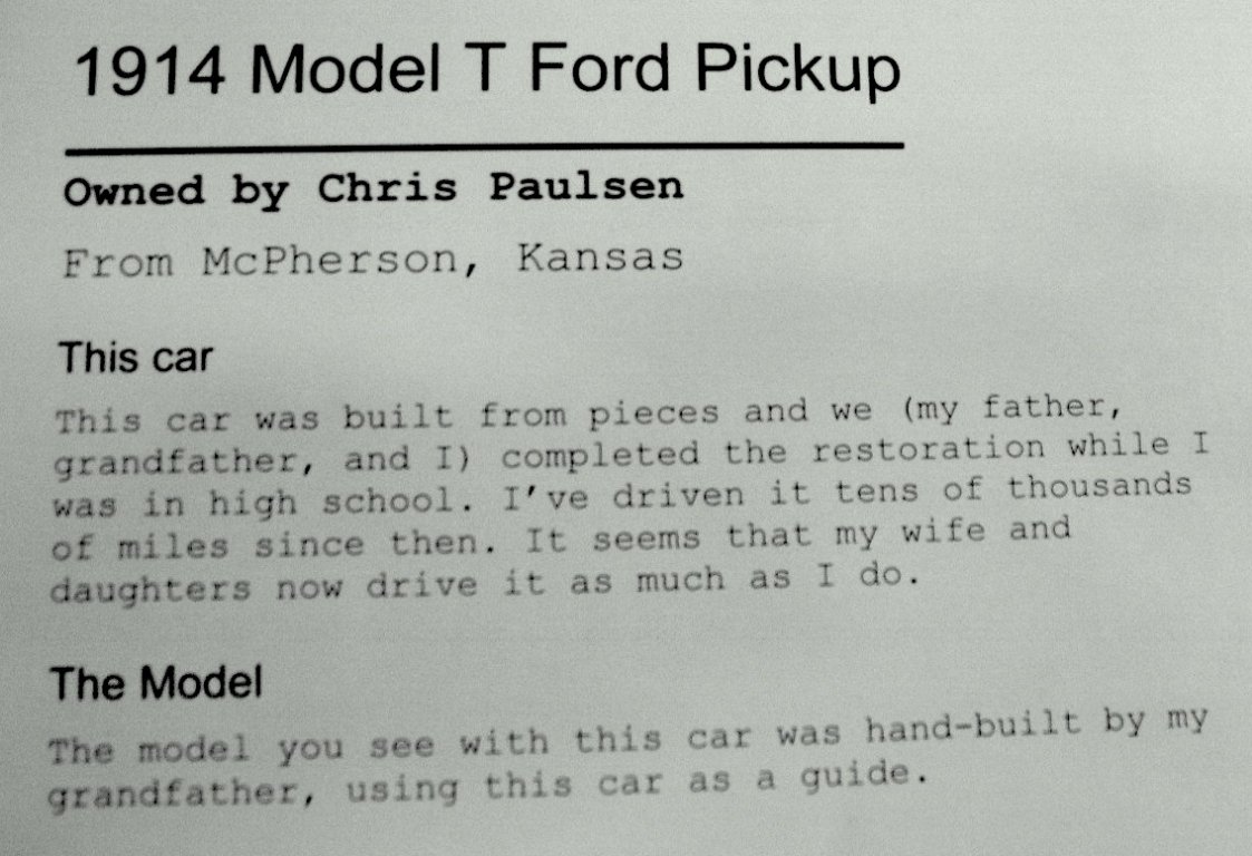 I think this was my thirteenth year going to this event (we missed a year in 2021). It was at the high school in Hutchinson, then at the college in Hutch for a few years, and in recent years at the college in McPherson. It's always worth the trip. I took a bunch of pictures, but looking through them I see I should have taken at least a couple more. Maybe Chris will post a photo of the model that was with his car. Somehow I missed it.