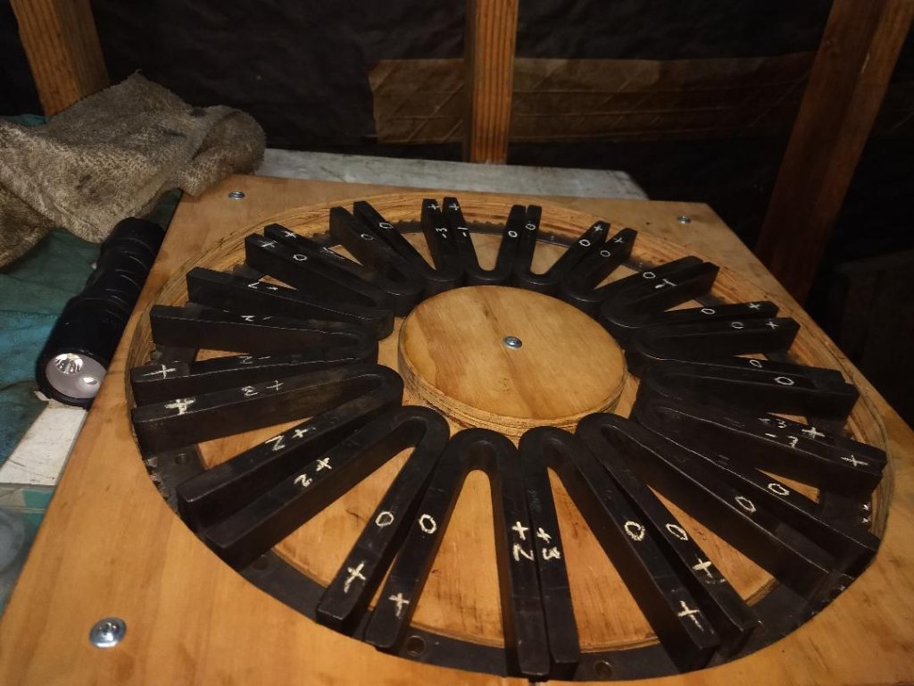 Current source: 12v truck battery, running. 14V indicated. The idea was to insure no weak voltage for the last magnets done. Continuous battery recharging.
