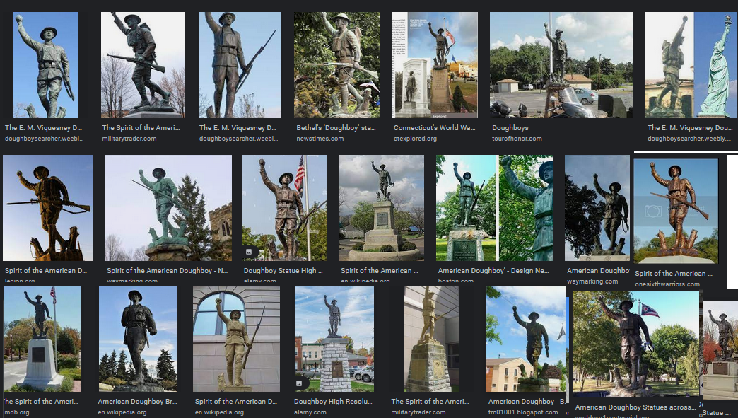 The information about "The Spirit of The American Doughboy" indicates that almost every city/own erected a variant of the original. Sculptor and artist, Ernest Moore Viquesney, was the man behind the famous doughboy statues installed throughout the country to honor World War I Veterans. Researchers believe there may at one time been as many as 845 doughboy statues scattered around the country, but only 145 have been documented to date. There are at least 88 remaining. The Bank building in the background of the discussion photo is likely to still exist, but I would guess the status was moved from that location shown.