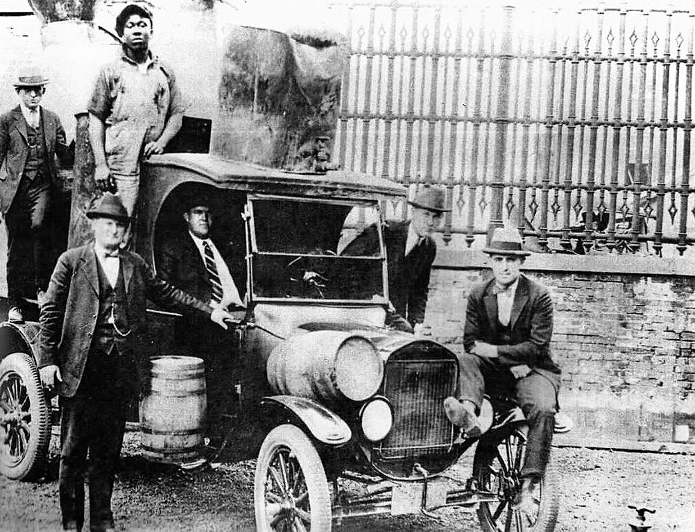 C-cab in front of iron fence with wooden barrels on fenders and metal tank on top... G-men, with busted moonshine still?