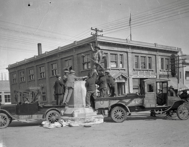 Another look at the statue rising to its base in Vernal, Utah.How it looks today.And the story behind it.