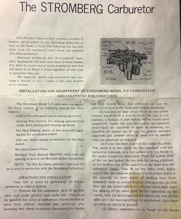 I’ll start this for hints on rebuilding your Stromberg OF carb. PLEASE JUMP IN if you have any hints or advice. I’ve often advocated that these are very simple carbs. If you can take apart a simple lawnmower carb, these are a piece of cake. If you haven’t, there isn’t much to them and I’d encourage you to get your hands dirty. Nothing better than a sense of accomplishment with model T ownership.