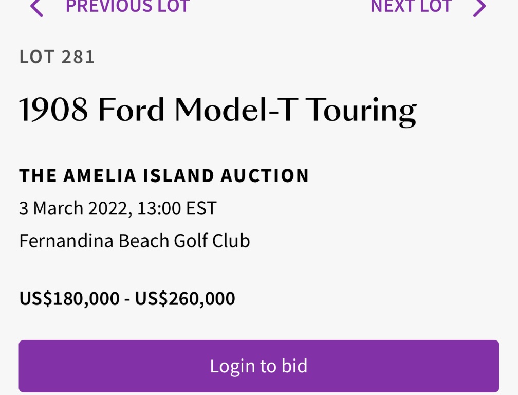 I used the Browse auctions button and found nothing about the Amelia Island event or #2. It seems Bonhams did something to their website that made the original link no longer functional.