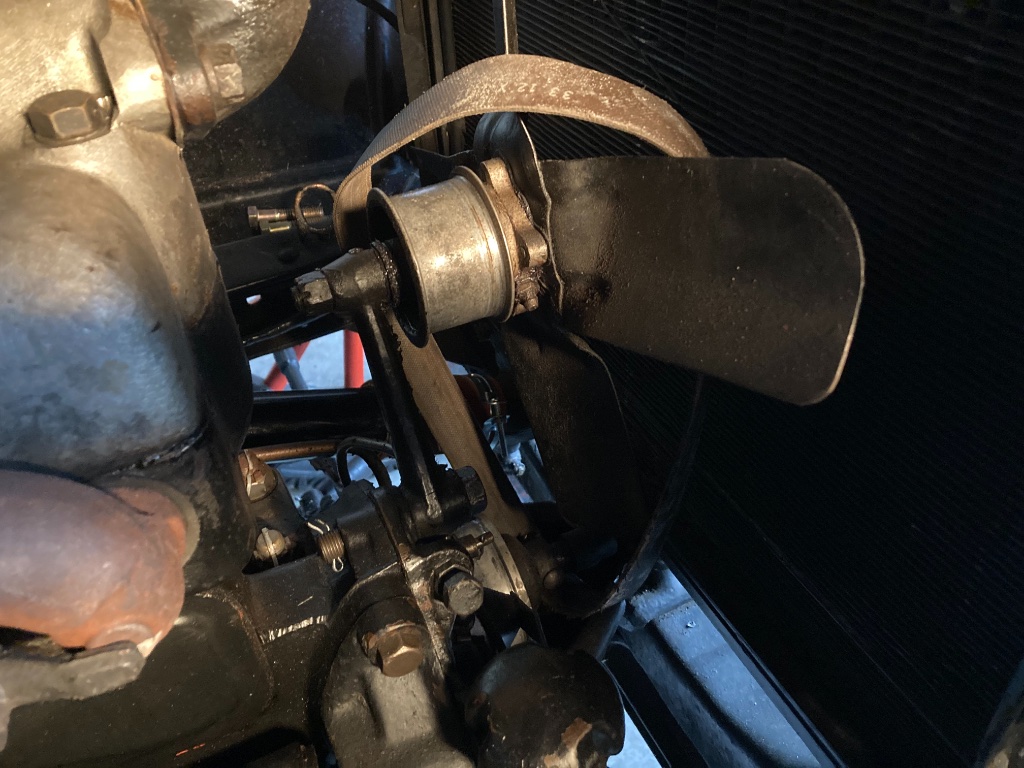 Now, back to the pulley issue: It appears the two pulleys are slightly offset when comparing the flanges and how they line up. Maybe not as much as a half-inch as I'd originally suggested, but they're slightly out-of-line. It doesn't appear to matter; the belt tracks fine and is not running up against the edge of the pulleys or doing anything strange. On the advice of a member of my local club I put the old fan pulley back on to evaluate how everything was working together. I can always replace the pulley with a new one since the consensus is that it's worn out.
