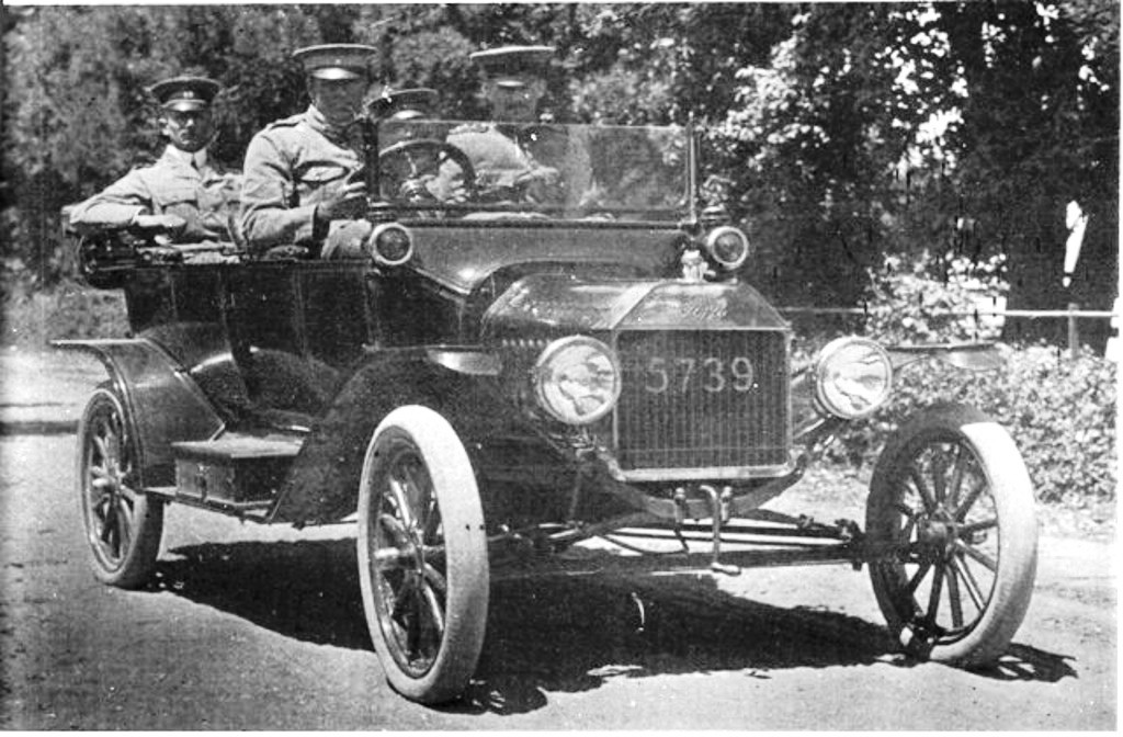 Photo of 1915-style Touring with odd post-mounted electric headlamps, no louvers in the hood, brass steering wheel spider and 1914-type steering gear box