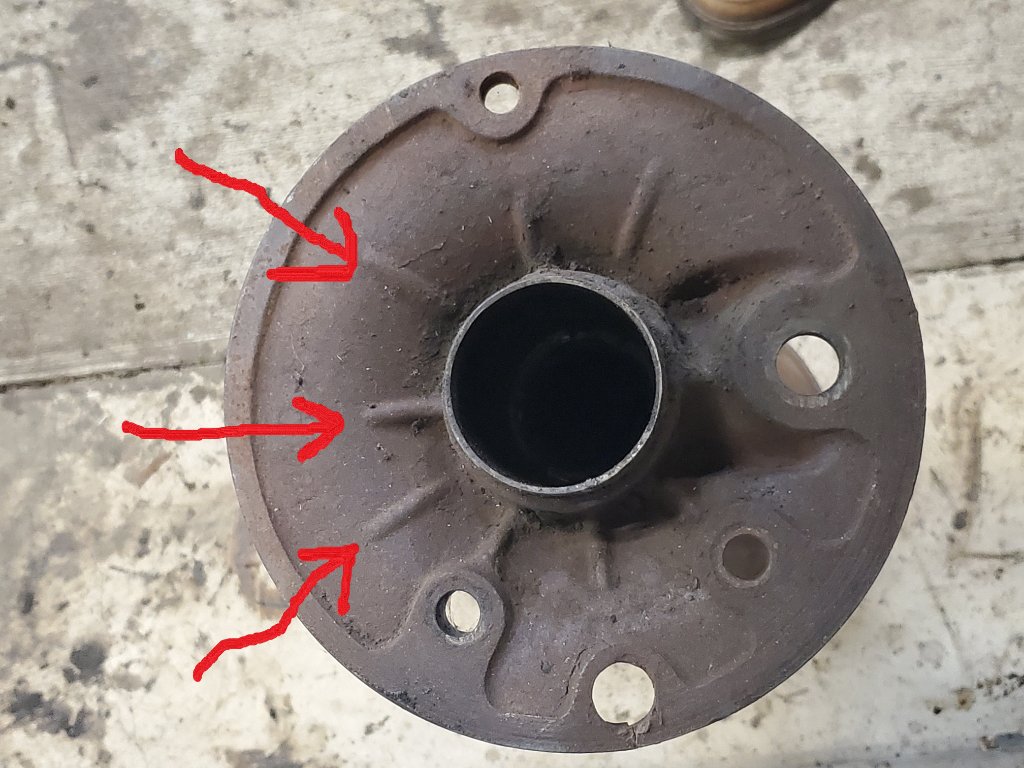 I am working with rebuilding two Ruckstells. One came as a complete assembly, after some 60 or 80 years out behind a barn along the Willamette River, with a slightly bent backing plate, and an original Ruckstell I.D.plate. It has a typical late 'teens/early '20's backing plate and is made for an "open" drive line spool. There is no drain plug in the housing. The housing to axle tube rivets are 3/16". There is no "rib" around the shifter mount area. On the outside end of the backing plate there are 4 reinforcement ribs, where all the other axle housings I have seen only have 3 reinforcement ribs (see photos below).