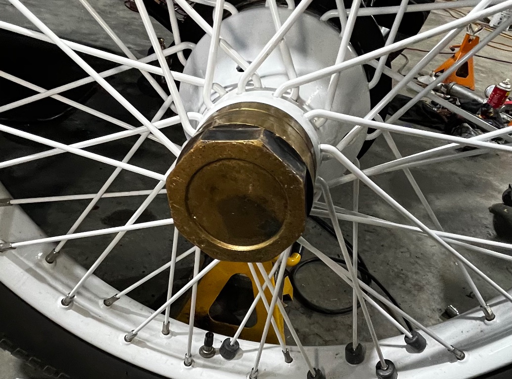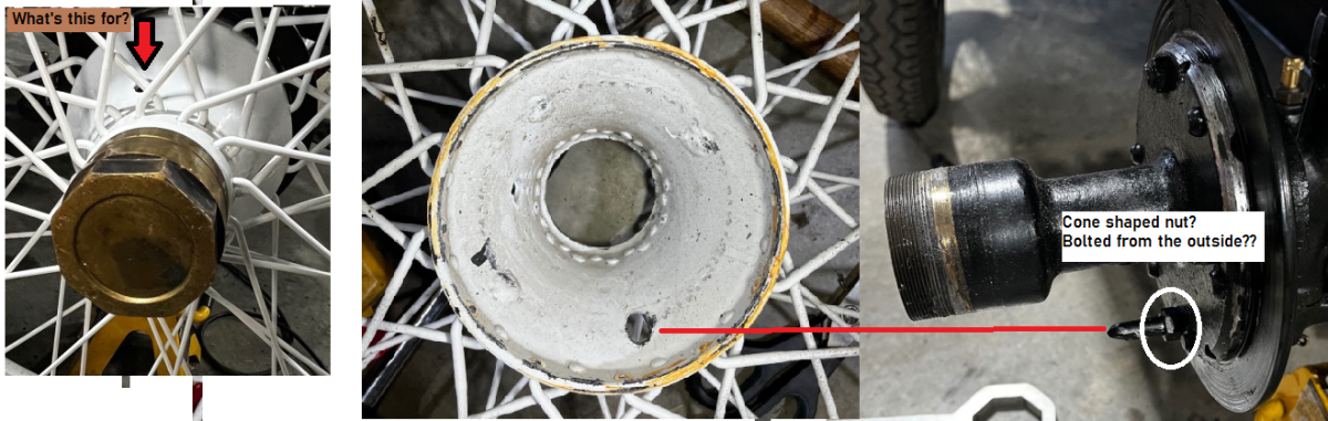 Hey there Will, interesting that your nearly unidentifiable rear wheels were converted to bolt on type, and your equally unidentifiable wheels (of a different make) were retained as knock off. The front hubs and caps smell homemade, and so every detail should be checked for proper function.