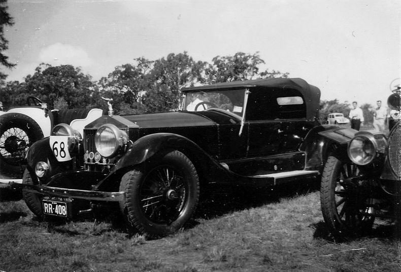 The wheels now needed a hammer to tighten and loosen them. Every now and then if someone was braking hard the left wheel nuts would come loose due to the momentum of the big winged nut having so much inertia. The nuts were replaced with new parts and the wing nuts thrown away. I remember is well as I had the job having the nuts and all the numerous levers, springs etc nickel plated and fitted. I only have one poor quality photo I can find of the RR but you can see the large knock on wing nut on the front left wheel.