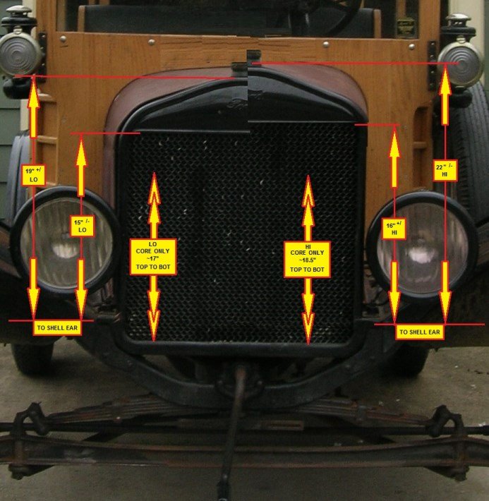 A high radiator shell has the sides splayed out towards the rear, so the shell sides follow the line of the hood side panels. The low radiator shell has the sides square on the the front panel. This is an easy way to identify the two types if you do not have a tape measure handy.