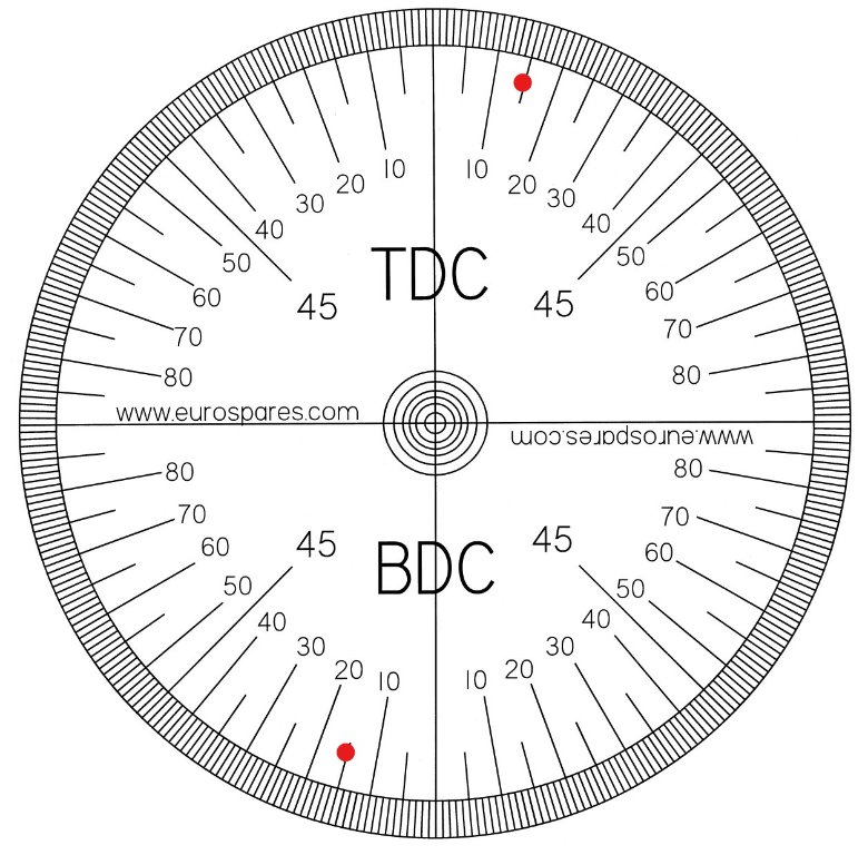 Dots for 1 and 4 ideally should land on top of each other, and 180 degrees on the other side of the chart 2 and 3 should overlay each other. All should land at 15-degrees PTDC. If they don't, start bending the contacts slightly until the firing point is at the 15-degree line. Bend the contacts, not the cup itself.
