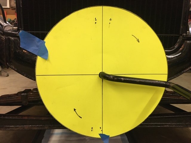 We started by enlarging a degree wheel chart to approx 2 ft diameter. Using poster board we cut a circle the same diameter as our degree wheel. From here we created a hole "dead center" of the circular posterboard (the hole being the just large enough for the crank handle to go through). Using scissors, a cut was made along the lower line from the bottom of the chart to the circular hole- this allows a snug fit between the handle and the hole. Next, tape the chart to the car so that it can't move. Then pencil a light line top & bottom where 15-degrees PTDC (PAST TOP DEAD CENTER) is on the vertical line, both top and bottom.