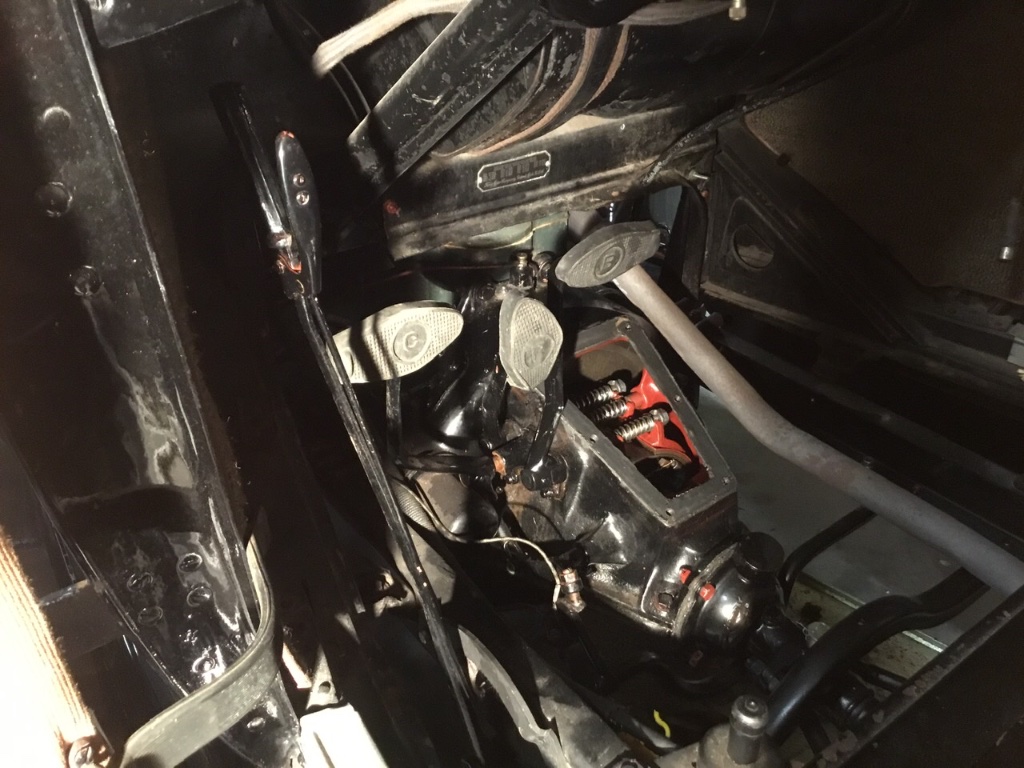 To all who have experience this, how did you remedy the problem? I assume since the brake pedal shaft has been bent down from aggressive over application, the best way to fix it is to bend it back up to where it was originally, where the other pedals are. My question is, what is the best way to do this? I was thinking of renting a short hydraulic bottle jack and wedging it between the back of the pedal and the back of the engine block and applying pressure, but that might damage the firewall since the firewall is between the head and the back of the pedal. I was also thinking that, if I take out the seat bench and seat back, I can open the trunk lid and run a come-along from the brake pedal to a tree and pull the brake up until it is where it needs to be. What say you? Jim Patrick