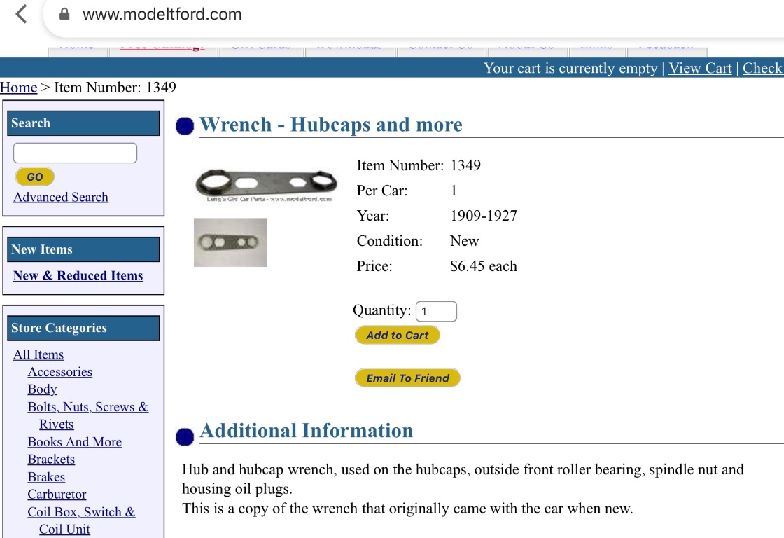 I have never seen an original tool like the odd shaped item that is the very early hubcaps wrench. I have found a three hole item that is part of my 1912 van toolkit. It is the only one I have ever seen that I could purchase. While it was a $2 swap meet purchase, it is worth way in excess of that.