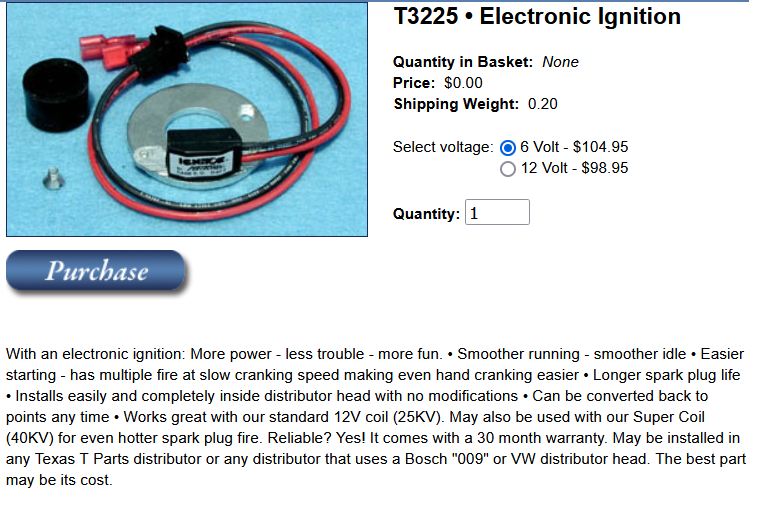 Hello all, I am looking for some direction on a recent purchase. I have been scratching my head and trying to figure out what has been causing a no spark issue for my '19 T. This on top of a leaky carb. So here is the set up of the vehicle, it's still on a 6 volt system. I have a main battery to run everything off of and there is a separate 6 volt battery just to run the starter. I get no spark out of the output for the lead wire. I have 6 volts to the primary +. The vehicle was my father's back in the day and it has no mags on the flywheel so going to mag and coils isn't really an option. It's running on a texas T distributor that has electronic ignition. I don't normally dabble in 6 volt or this era in general. Oh the coil has been replaced with a proper VW 6 volt coil from my local NAPA. I'll post some pictures but I am kind of at a loss as to where to check next. Any help would be greatly appreciated.