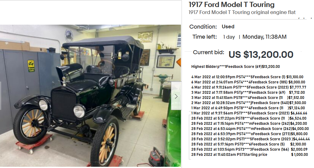 An action is not representative of inflation, it only represents the level of desire a person has to own an object and the resources they have to purchase it.Michael Peternell wrote: ↑Sun Mar 06, 2022 10:25 amWanted to check this out but I can't find it.TheSaintDiscJockey wrote: ↑Sun Mar 06, 2022 5:39 amCan't say I have the answer to the question of rising T values, but I am getting a kick out of the bidding war going on now on Ebay for a 1917 T touring car. It is beautiful and would be a great addition to anyone's collection. As of this writing, the bid is $13,200. The auction ends Monday morning.