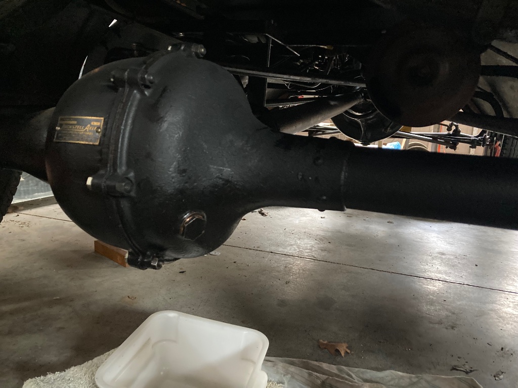Concerning the oil level in the rear axle: I believe there are 2 different ways that it needs to be checked, depending on the year model of the axle. Earlier axles had the oil fill plug located higher on the housing, and on those axles, the correct full level is an inch or so BELOW the plug opening. On the later axles, the plug hole is located lower on the housing and on those axles, the correct level is at the bottom of the plug hole. Any checks should be made with the car on a surface that is level, both front to rear and side to side. Overfilling the axle will result in oil leaking out onto the emergency brakes.