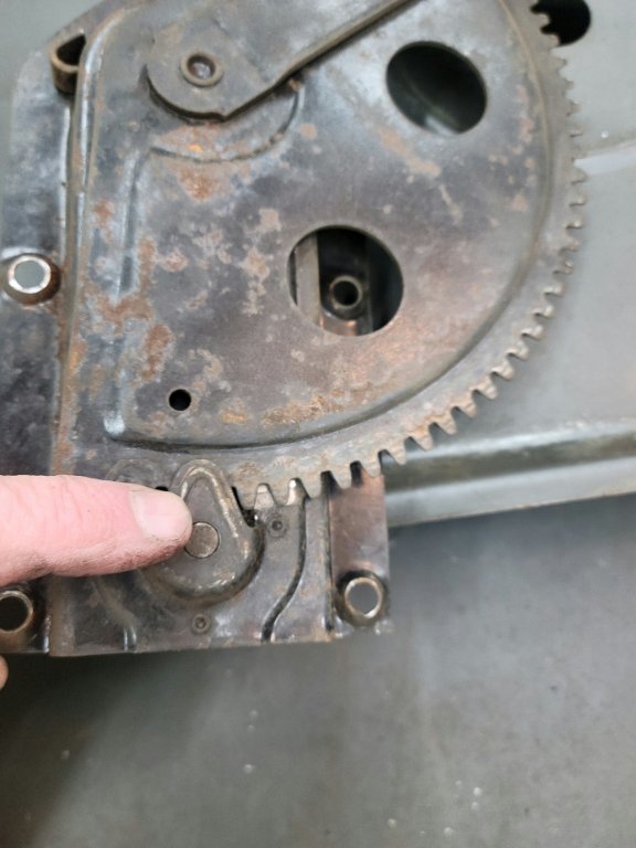 I got the innards of the door apart tonight. After 50 years I figured out what was wrong with the window mechanism. The part of the regulator where my finger is pointing allowed the gear to slip off and the crank no longer worked. A couple firm hits with my ball peen hammer and the mechanism works like new.