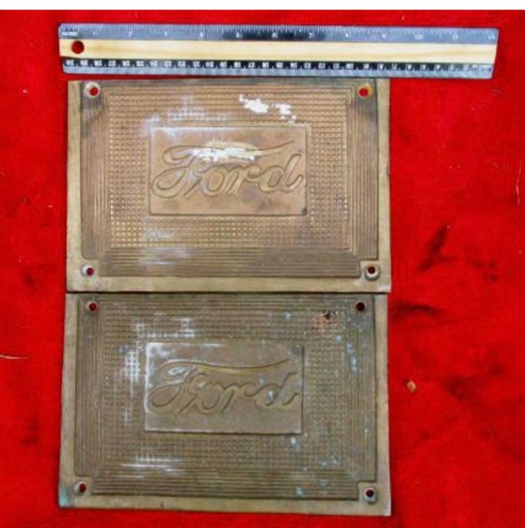 I have one brass step plate with the rubber Ford script insert on my 1912 chocolate van. It goes well with all the other brass.
