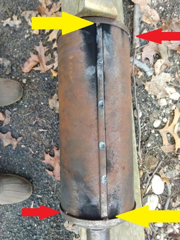 Thanks for the replies. I looked carefully at the Snyder's and it looks exactly the same (six spot welds on the grooved/lock/rolled seam). Were all vendor's mufflers made by Snyder's? Where the side seam of these mufflers enters the end caps there is that same gap on either side (where my gaps are 9/64 inch wide.