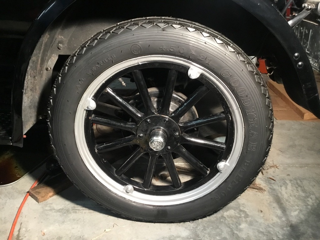 With the help of my Hercules rim spreader, I got all the new 21” Goodyear tires, tubes and flaps mounted on the split rims. By the last one, it got so much easier than the first one. Before mounting each one, I repaired any broken rim locks and removed all rust with muriatic Acid and neutralized with baking soda, then painted the rims silver with very durable “Sherwin Williams Silver “ metal roof paint. They couldn’t have turned out better and it is a relief to get this job done. Now I can concentrate on getting the engine in good running order and am very anxious to take it out for a drive once I get ‘r running. Thanks everyone for your help. As usual, your advice was very helpful. Jim Patrick