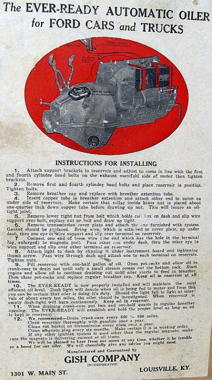 I was working on a job in Kentucky as a boilermaker sometime in the 1980s. I passed a yard sale at an old house on my way to work. Being the junker that I am, I had to stop. There were a couple of the NOS Ever ready oilers on a table for 5.00 each. The old man told me his dad had manufactured them in the teens 20s . He also said someone had bought over a 100 of them the day before. The two I just bought he had just found in the house. He mentioned that the roof of the building they were made in had collapsed is why he was cleaning the building out. I had to ask if I could look in the building. He said it was OK to dig around in the building if I was carefull. The building was a rock building about 20 x 30 in size with a shed room down one side. The roof had collapsed on the main room, but the shed roof was still pretty good but leaking . It looked like the shed had been almost full of the oilers. Lots of them had been ruined by the roof leaking, others had been torn up by rats and mice, others were just dumped out on the floor. By digging in the piles I was able to get 50 boxes that were complete and still had pretty nice labels. The old man said since I was doing all the work I could have any I found for 1.00 each. I was late for work that day but in hindsight I wish I had just spent the whole day digging in that building. The only really useable part of these oilers is the low oil light switch under the trans inspection door and the oil light on the dash. They work real good as a low oil "idiot" light.. There were 100s if not a 1000 of them scattered in the pile of damaged boxes. This was one of those finds that I will always remember and also regret not pursuing further.