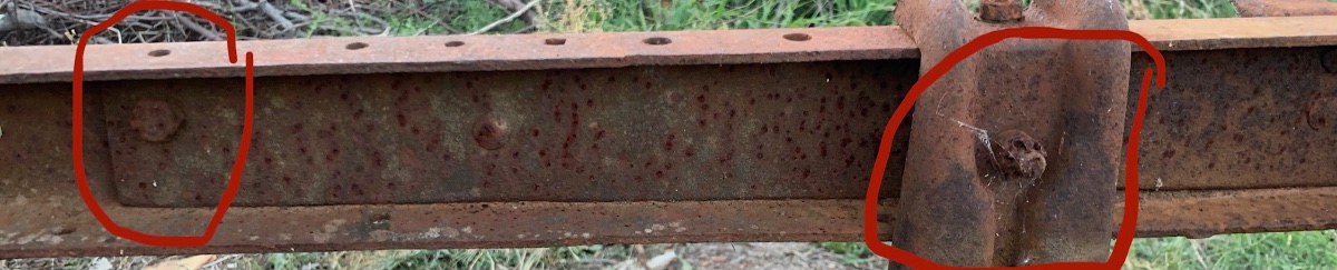 You have fishplates inside the frame rails. See the circled areas showing the plate in one side and rivets on the other. Only the earliest frames had fishplates. Have you measured the frame rail thickness? Is it thinner than .188" (5mm)?