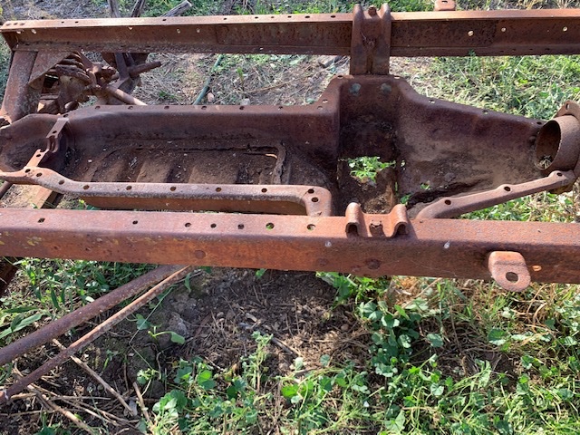 Chassis are made of thick steel. There is still a lot of strong, salvageable steel there under that rust. After removing all of the parts, the chassis could be white-blasted down to the bare metal with baking soda, walnut shells, or glass beads to preserve the numbers and, once blasted, all the cracks can be v-d out, welded and dressed smooth. Then prime and paint. No need to junk it. Jim Patrick.